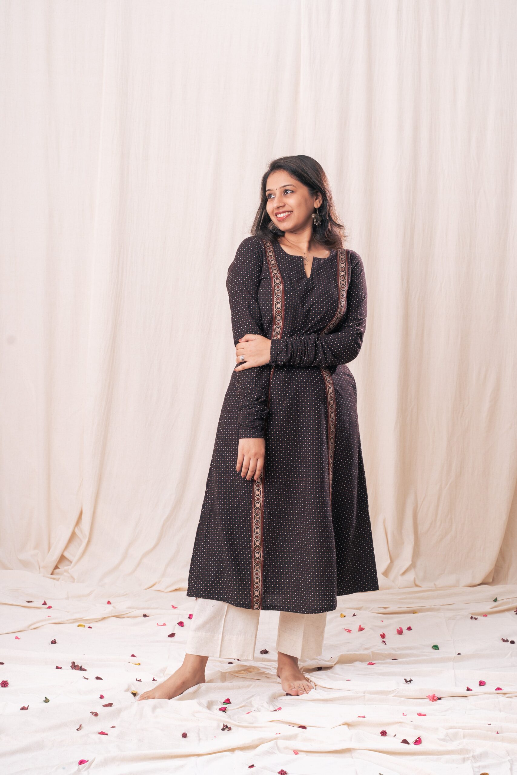 This Ajrakh Polka kurta features chic churi sleeves with two pockets, Crafted from soft fabric, it combines traditional artistry with modern elegance, perfect for festive occasions or casual outings.