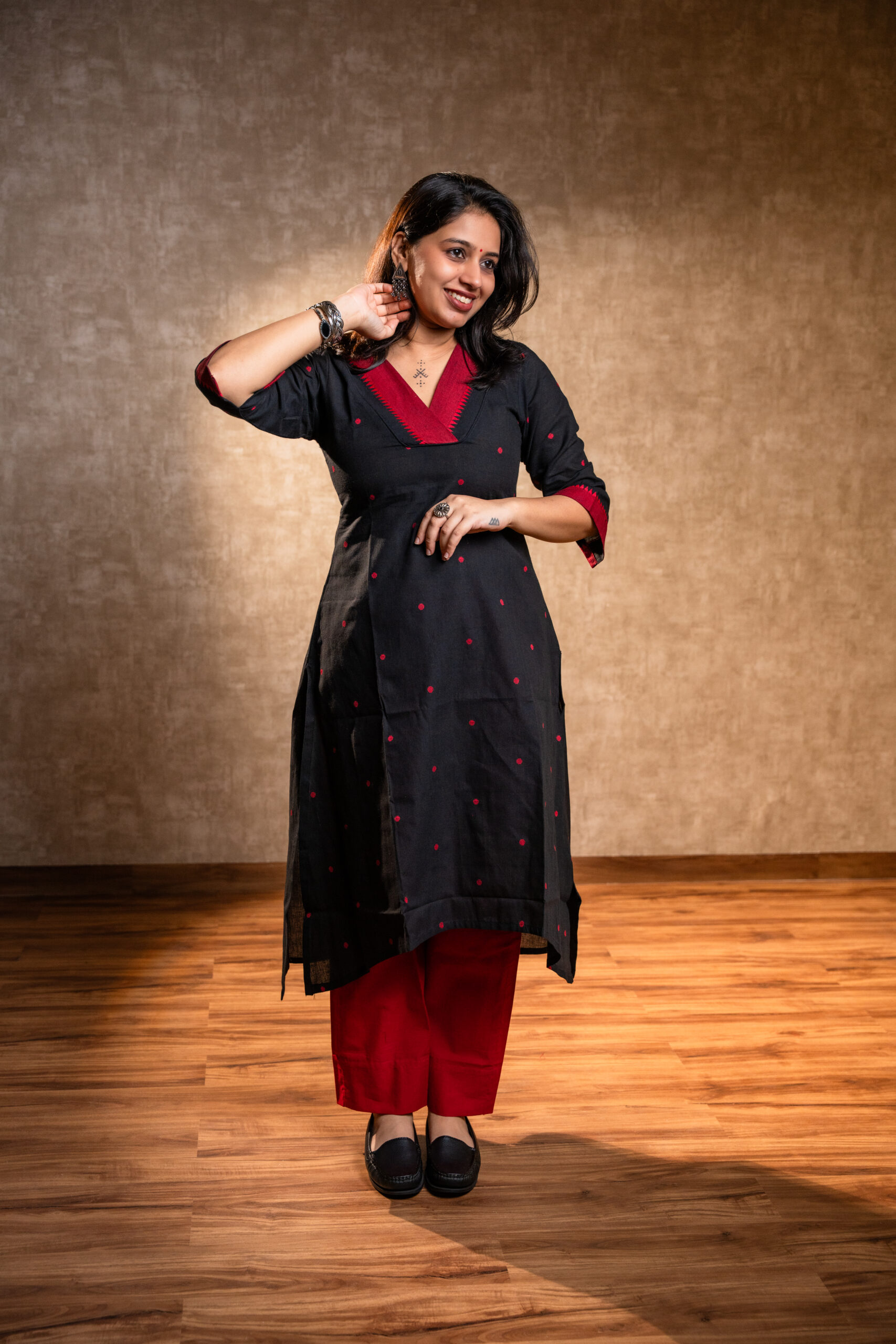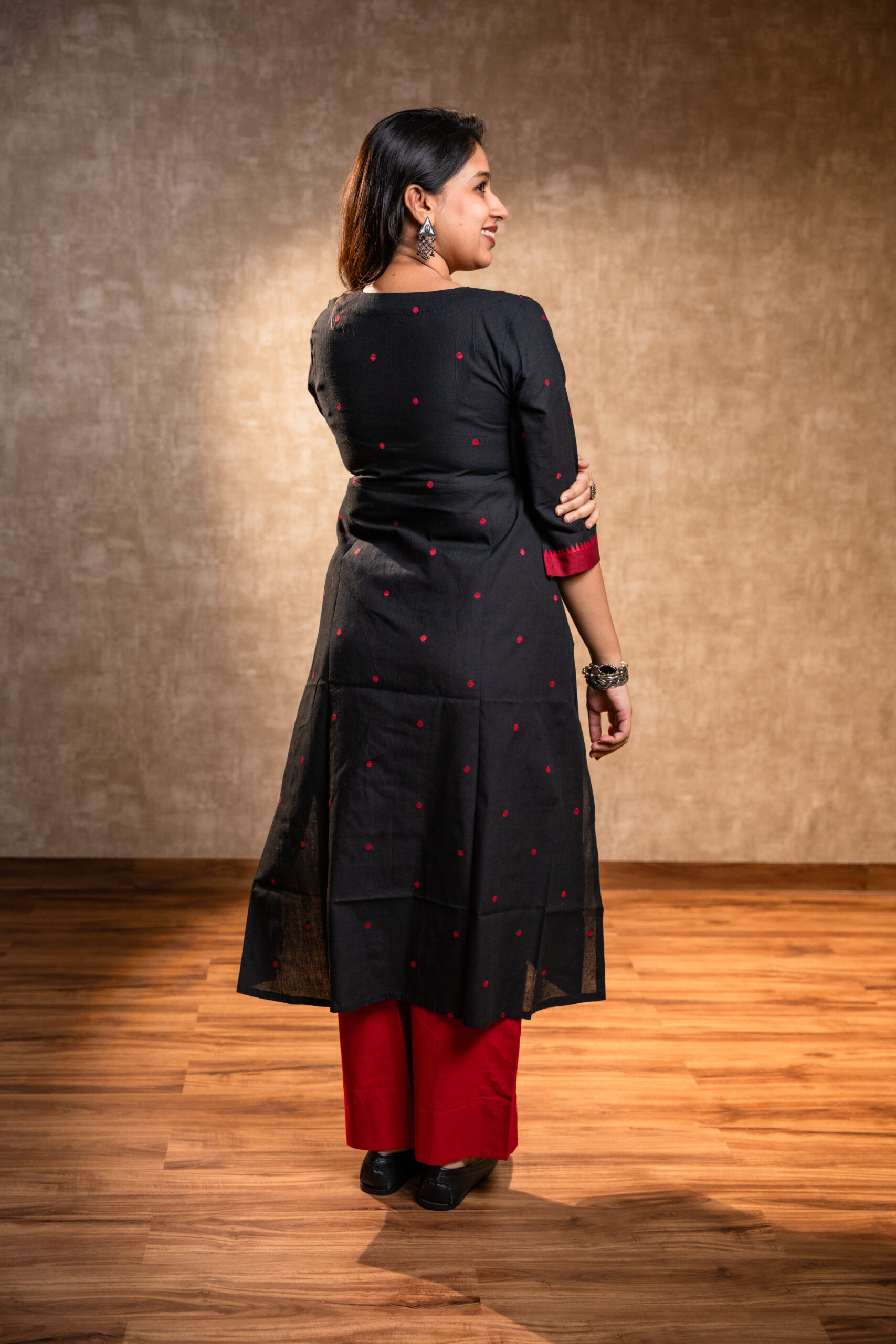 Effortless, elegant, and easy to wear — this set pairs a black full-sleeves kurta with red cotton pants for a timeless look. The kurta features a side slit and uneven hemline, adding graceful movement and a touch of modern detail. Crafted from soft, breathable handloom cotton, it feels soothing on the skin, while the cotton pants ensure all-day comfort with pockets on both sides.