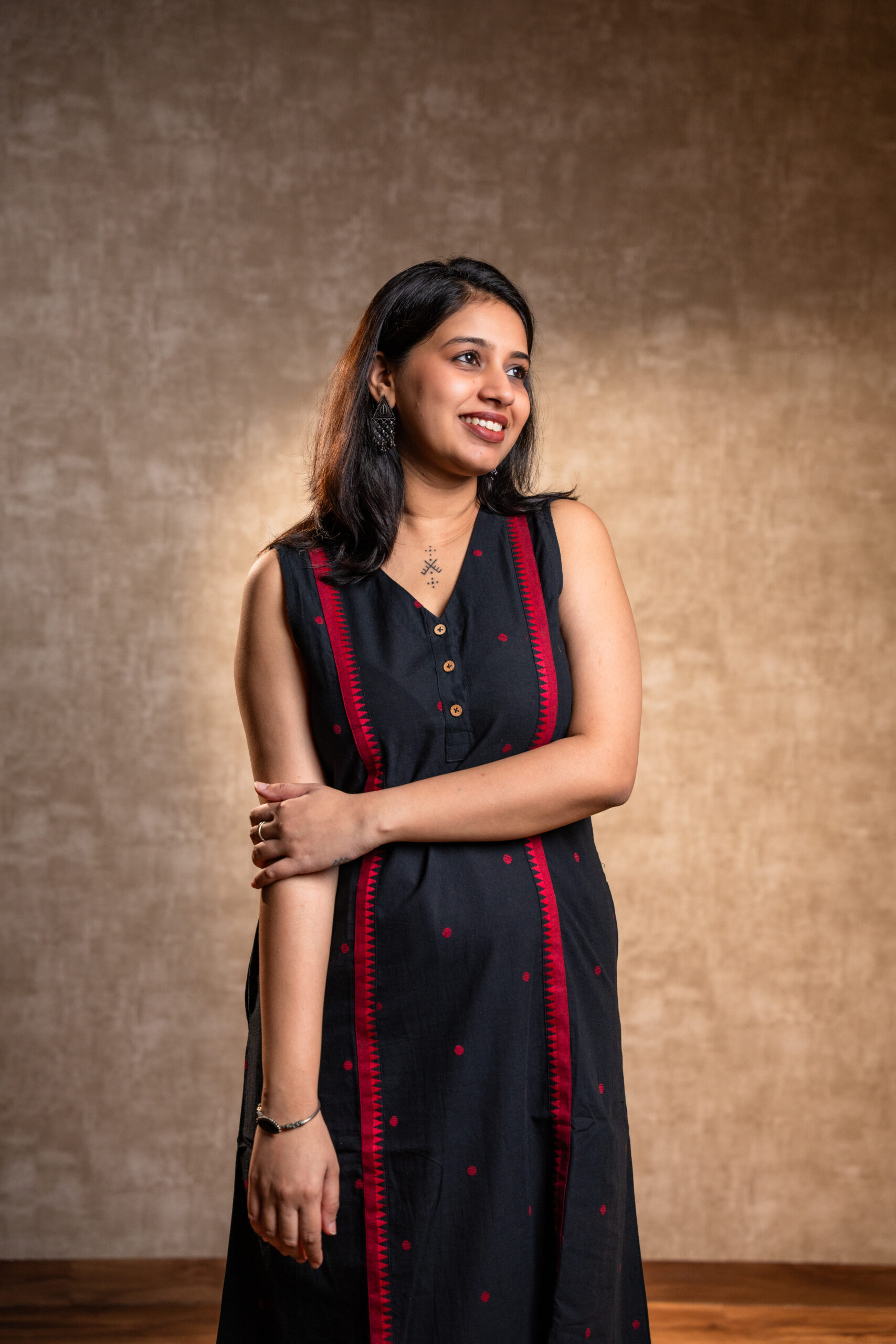 Classic, bold, and beautifully effortless — this black sleeveless kurta set is designed for women who love timeless style with a touch of confidence. The kurta features a flattering V-neckline, front buttons, and side slits for easy movement, crafted from soft, breathable cotton that feels gentle on the skin. Paired with red cotton pants featuring pockets on both sides, this set adds a perfect pop of color while keeping comfort at its core.