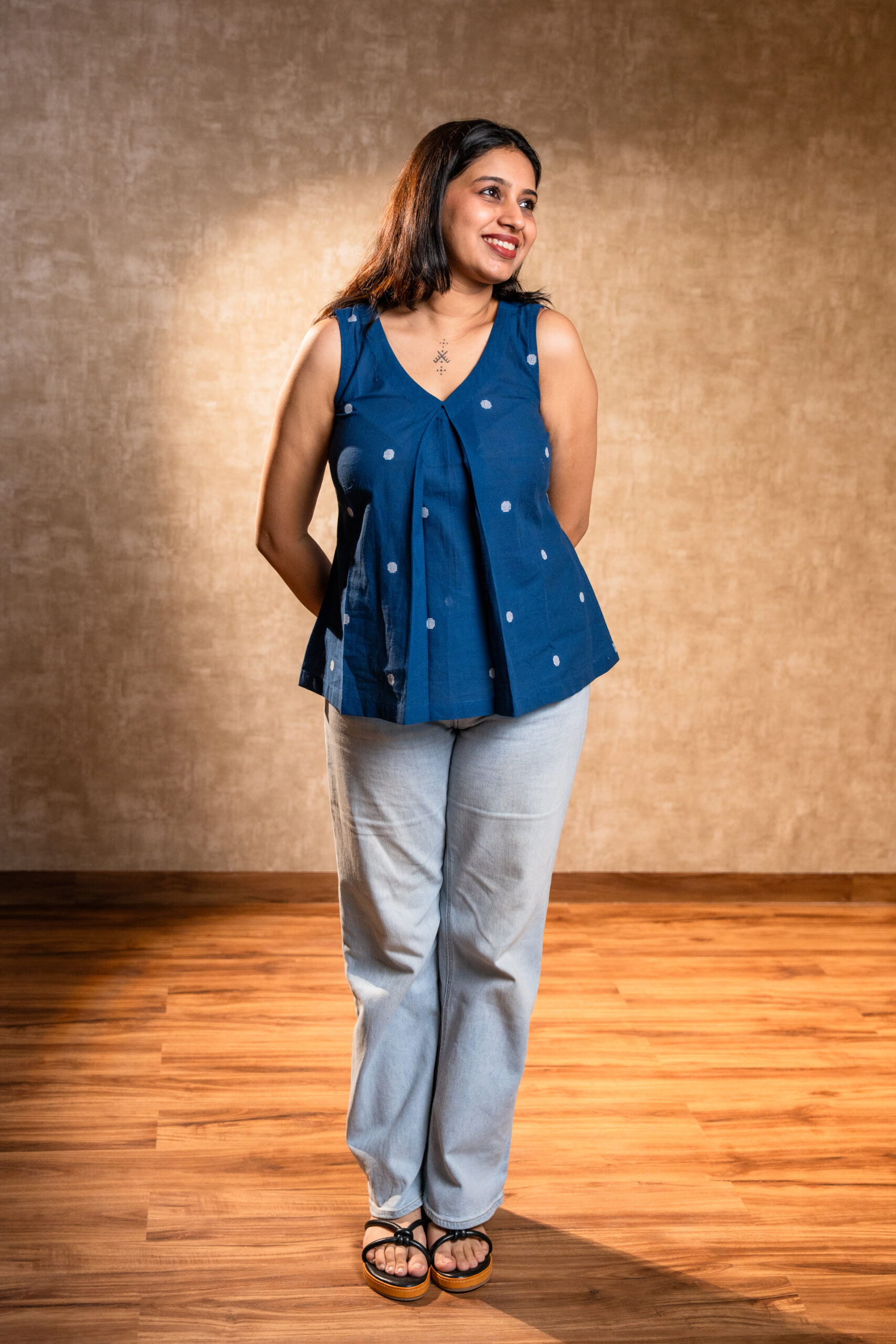 Perfect for your everyday wear, this blue handloom sleeveless kurta features delicate white detailing that adds subtle charm. The minimal front pleat detailing elevate the look, combining comfort with effortless style.