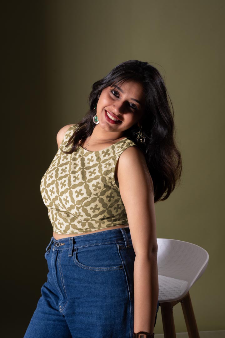 This green Dabu blouse top features rich, artisanal block prints and a vibrant hue, perfect for adding a touch of traditional charm to any outfit.