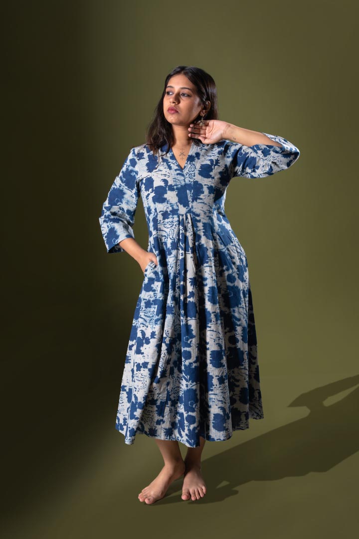 This indigo blue V-neck dress features minimal gathers at the front and two convenient pockets for a blend of style and practicality. Crafted for comfort, it’s perfect for everyday wear or casual outings.