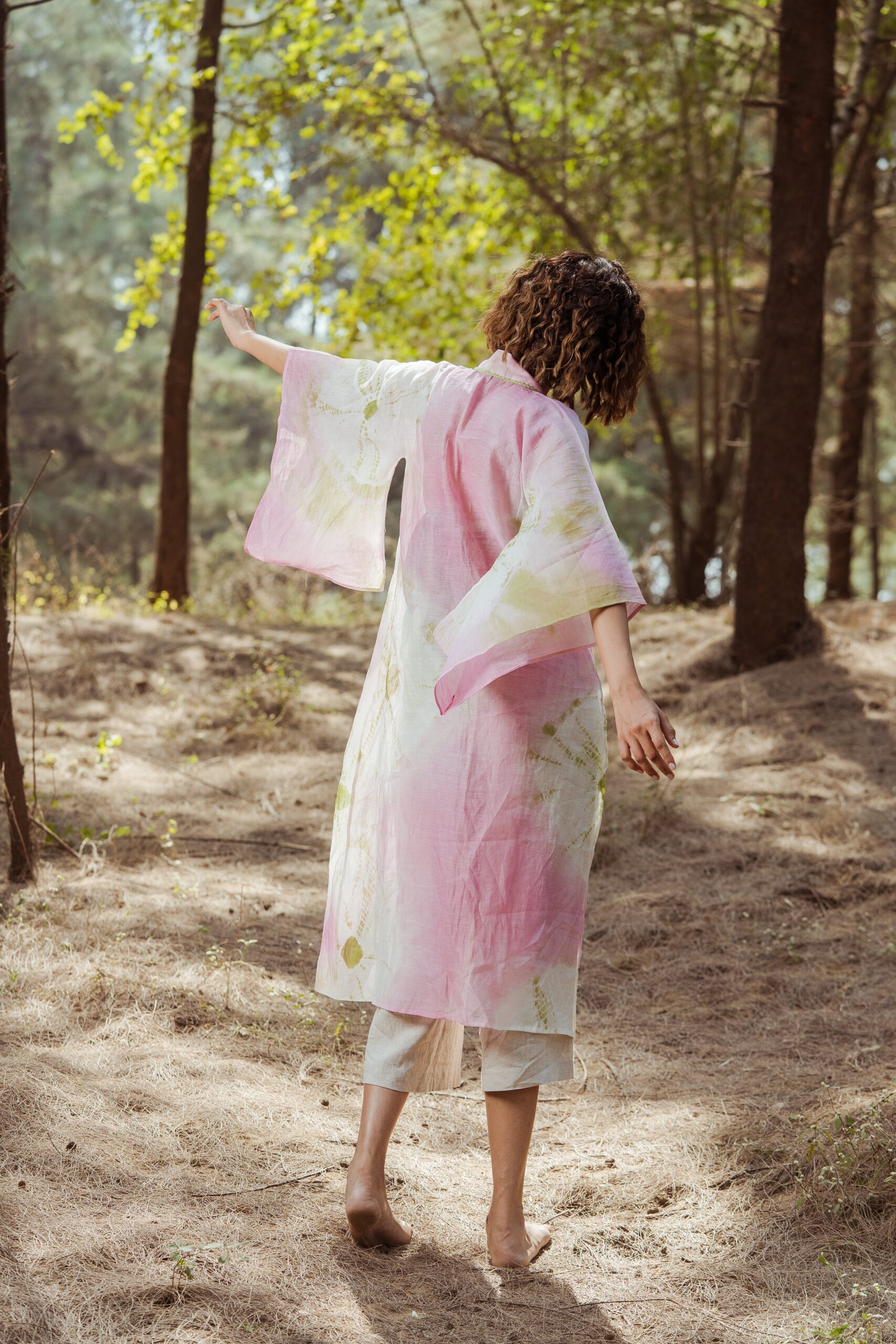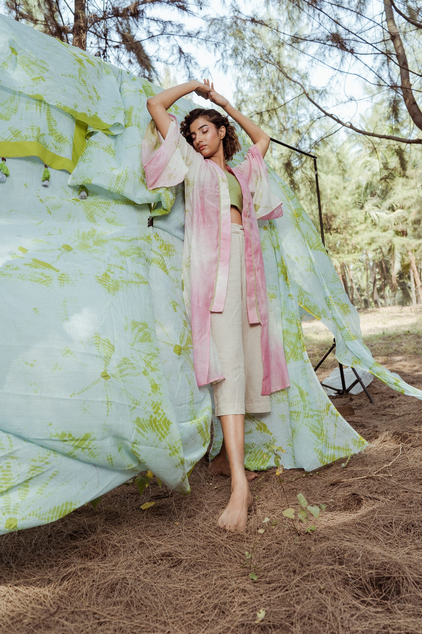 A stylish kimono jacket featuring intricate braided detailing along the collar, extending gracefully down the full length of the coat. This unique accent adds texture and a touch of artisanal craftsmanship, enhancing the jacket’s relaxed yet sophisticated appeal.