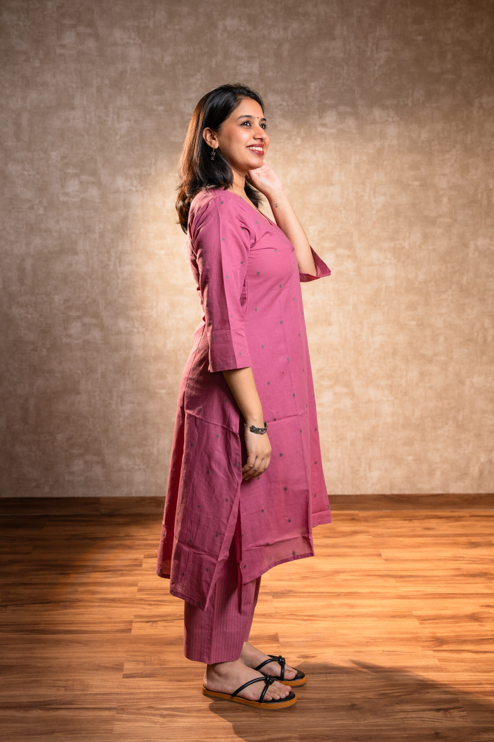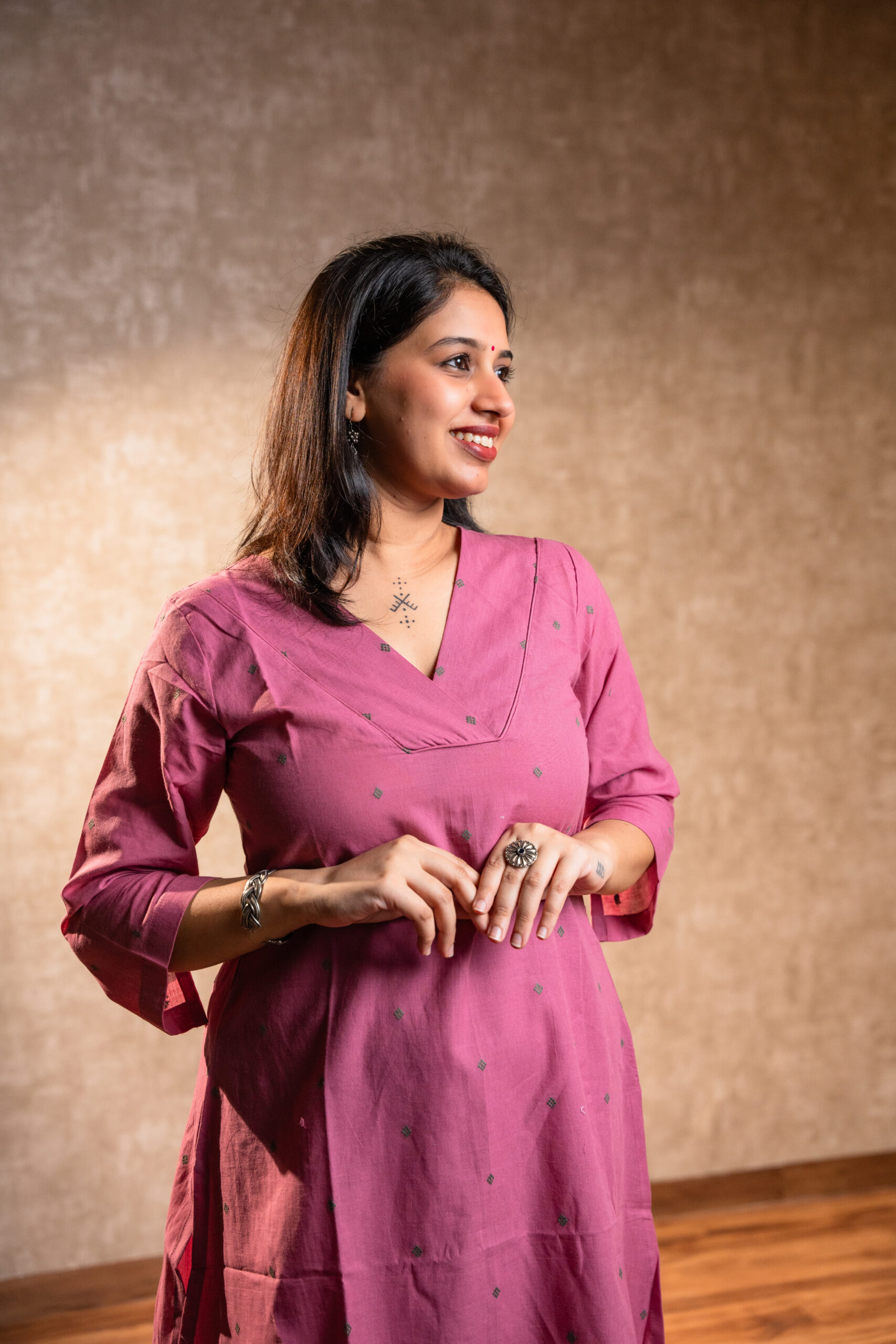 A blend of comfort and character — this full-sleeve kurta is crafted from soft handloom cotton that feels naturally soothing on your skin. Designed with a graceful V-neckline, side slits, and an uneven hemline, it adds effortless movement and modern appeal to a classic silhouette. Lightweight, breathable, and versatile — perfect for days when you want to look polished without trying too hard.