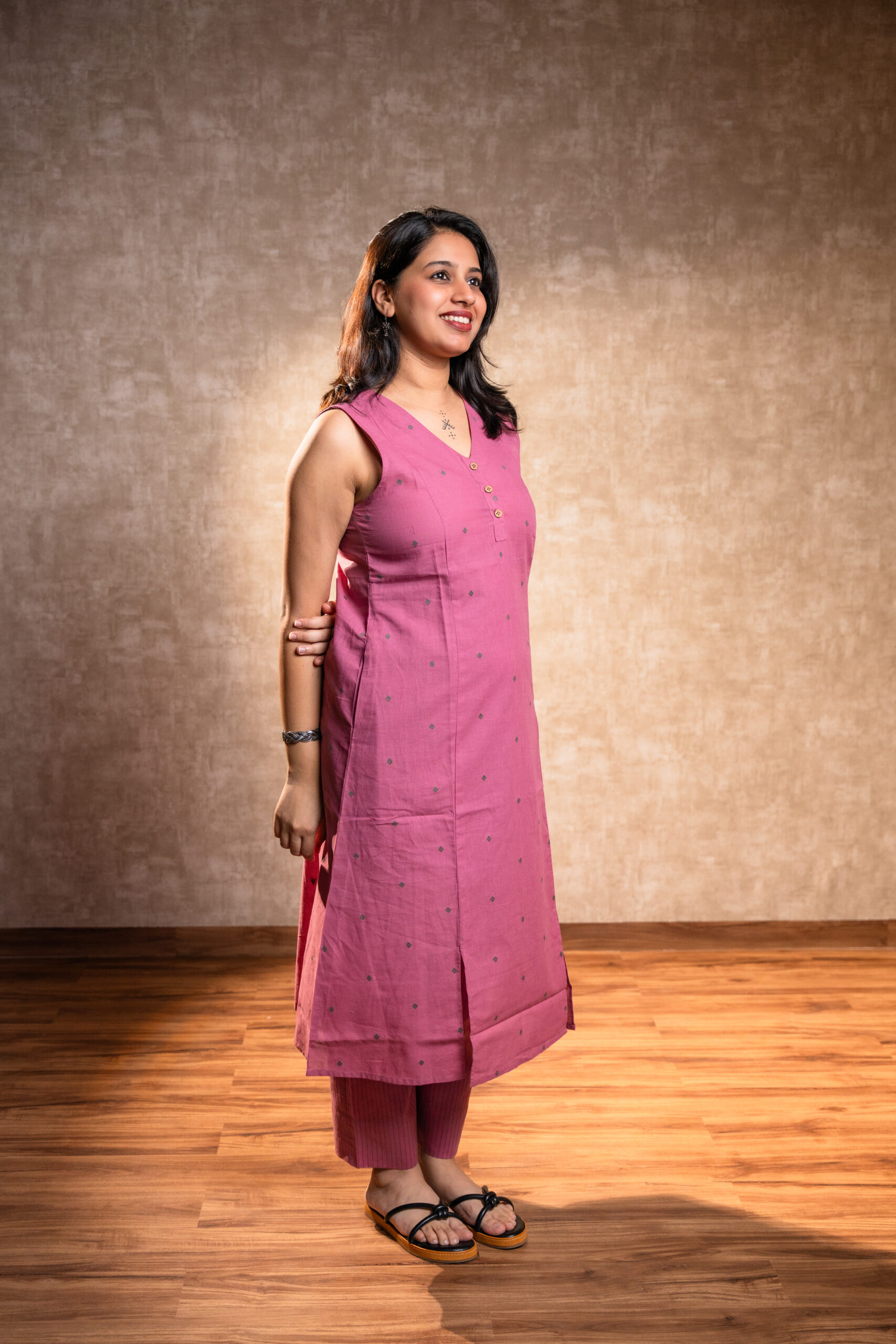 Effortless, elegant, and made for everyday ease — this pink sleeveless kurta set brings together comfort and charm in equal measure. Crafted from soft cotton, the kurta features a clean V-neckline and a straight, flowy silhouette that flatters every body type. Paired with matching pink cotton pants featuring pockets on both sides, this set is perfect for days when you want to look put-together without trying too hard.