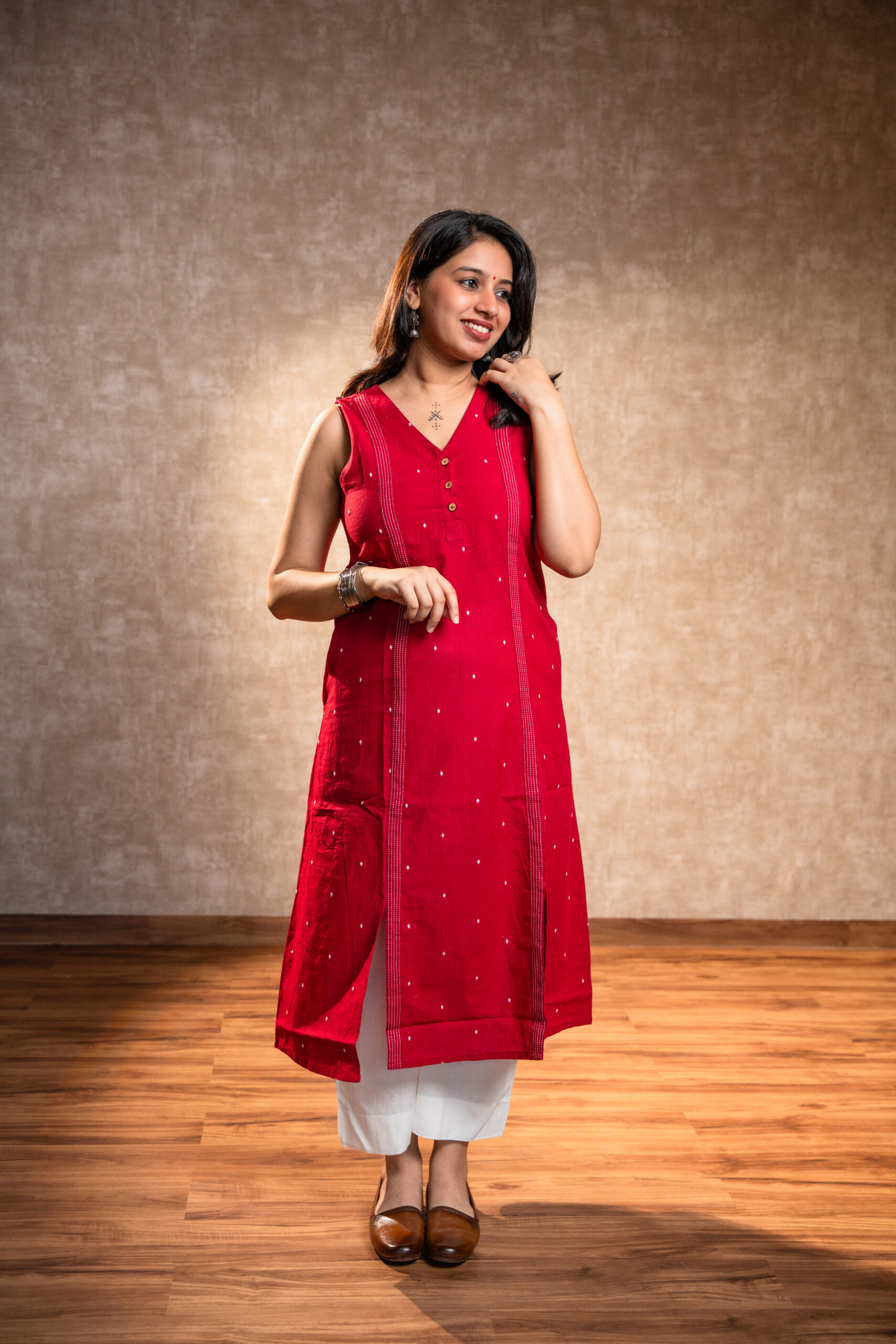 Bold yet effortless — this red sleeveless kurta set is the perfect blend of comfort and statement style. The kurta features a sleek V-neckline, front buttons, and side slits for ease of movement, crafted from soft, breathable cotton that keeps you comfortable all day. Paired with white cotton pants featuring pockets on both sides, this set balances vibrant charm with everyday practicality.