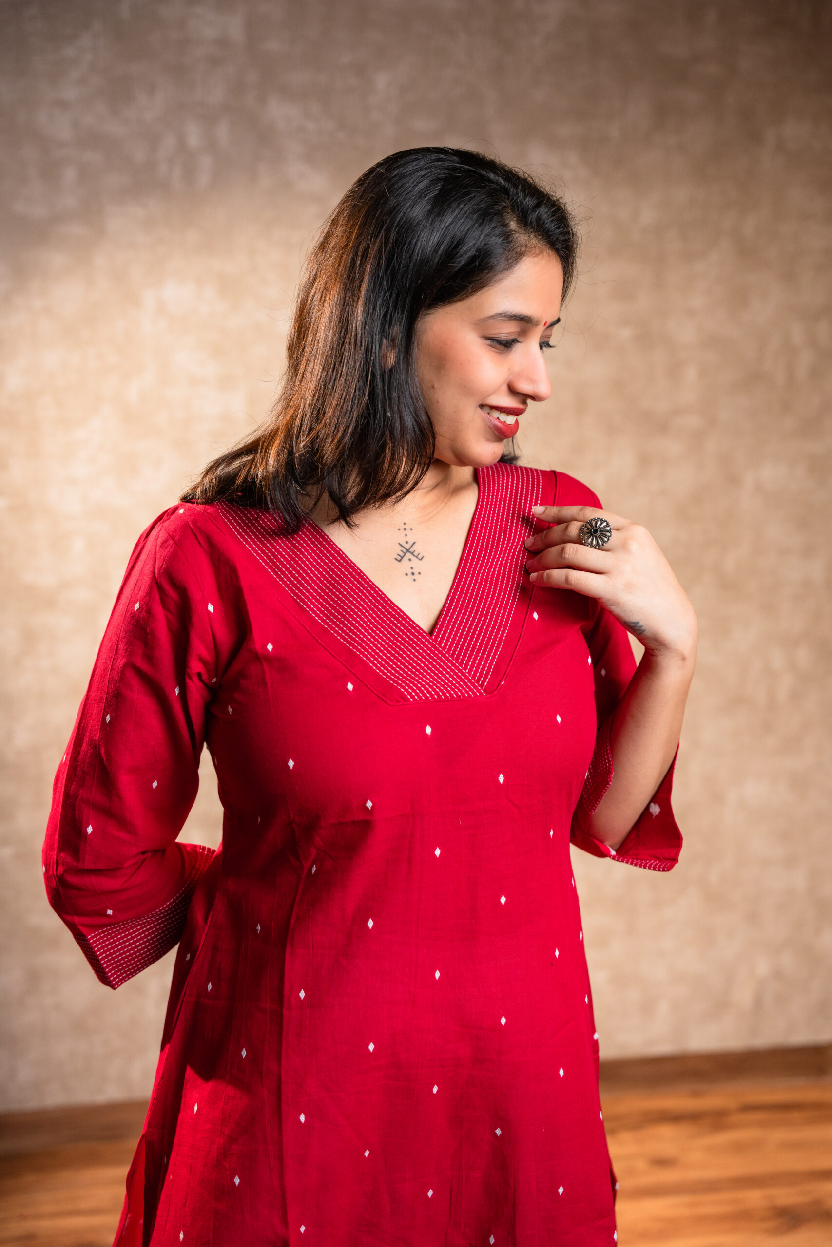 Bold, bright, and beautifully balanced — this red handloom cotton kurta set is a perfect blend of comfort and statement style. The kurta features a flattering V-neckline, side slits, and an uneven hemline that adds a modern edge to a timeless design. Paired with soft white cotton pants featuring pockets on both sides, the set keeps you comfortable through long days while making you stand out effortlessly.