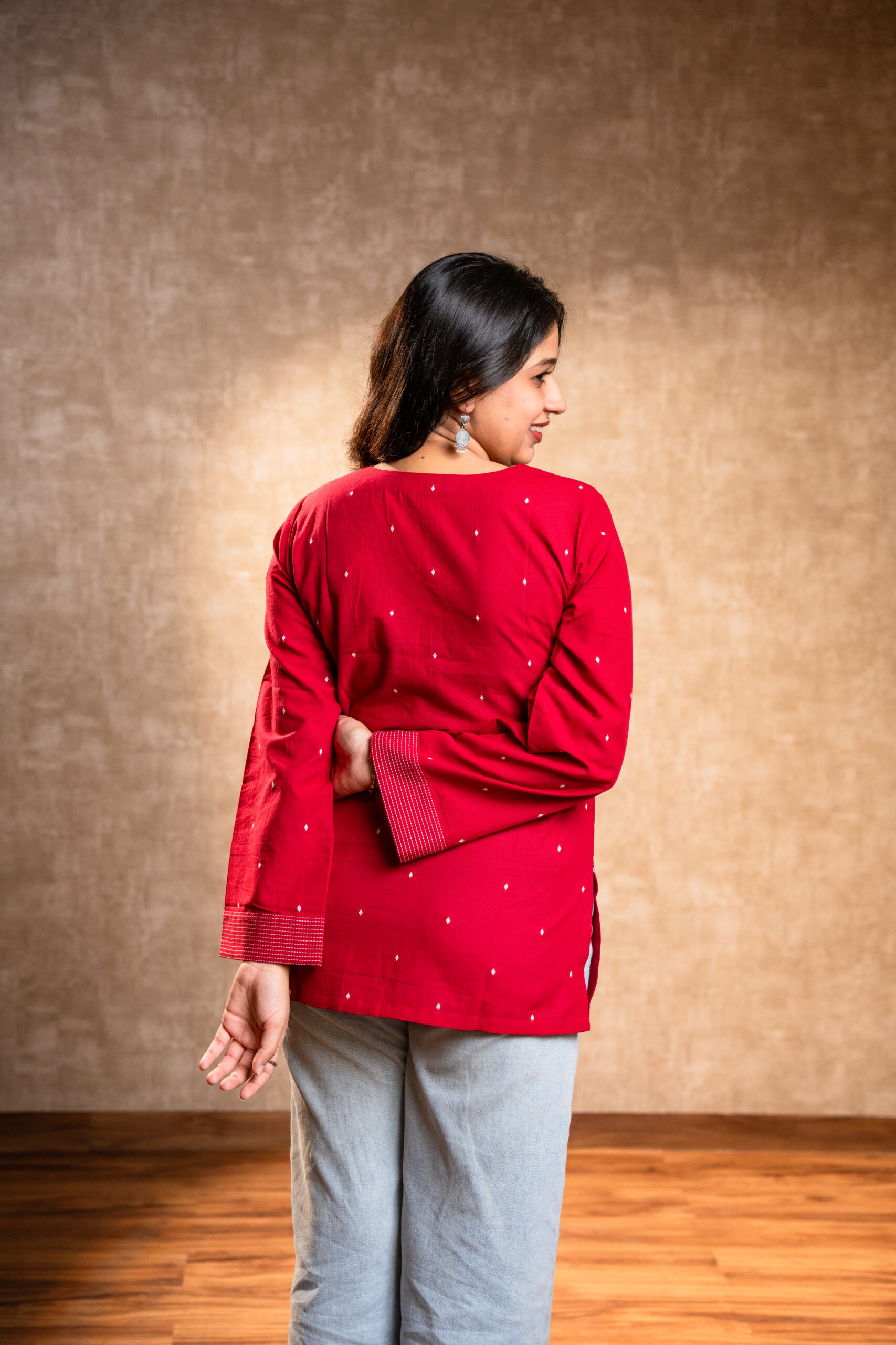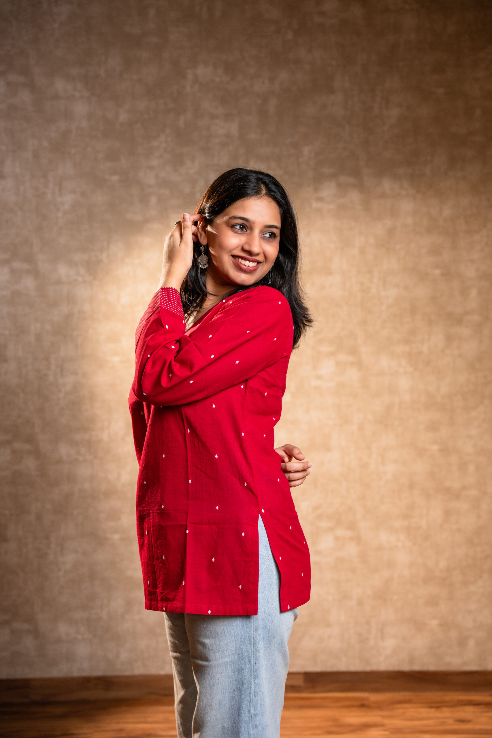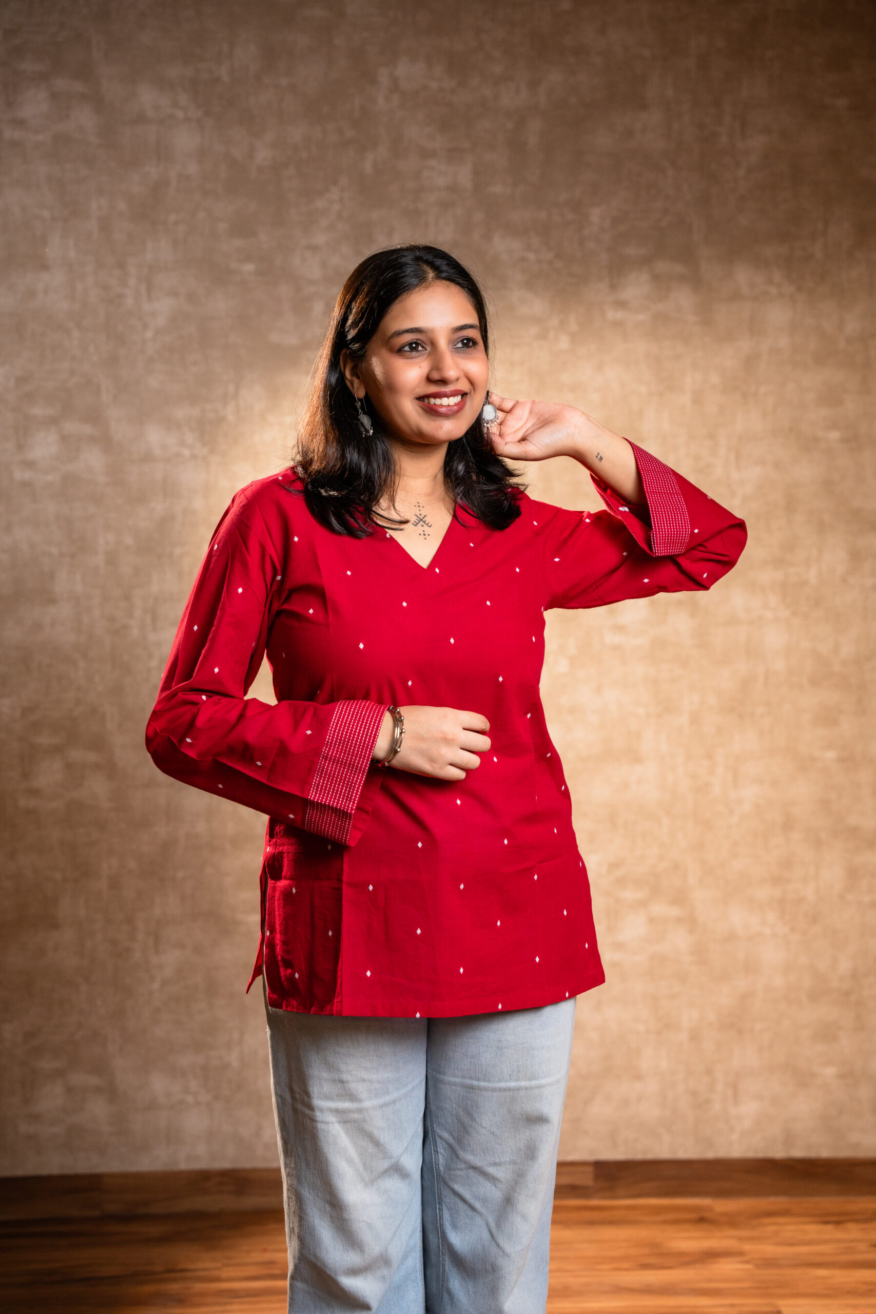 Crafted from pure handloom cotton, this kurta feels as soothing as a gentle breeze on your skin. Designed with a flattering V-neckline and elegant bell sleeves, it blends traditional craftsmanship with a modern silhouette. The breathable handwoven fabric keeps you comfortable all day long — whether you’re working, travelling, or just taking it slow.