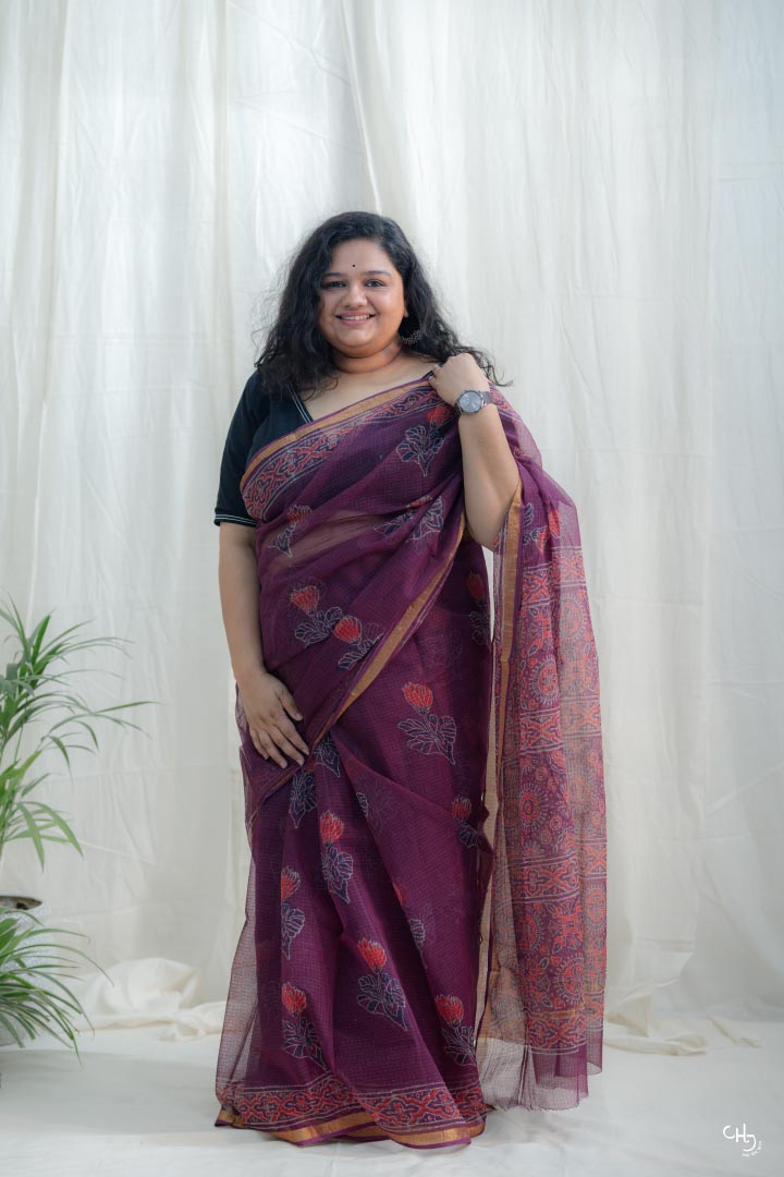 A delicate blend of Ajrakh-inspired prints with subtle floral motifs on a rich purple Kota Doria weave. Light, breathable, and full of charm, this saree brings a graceful touch to any occasion.