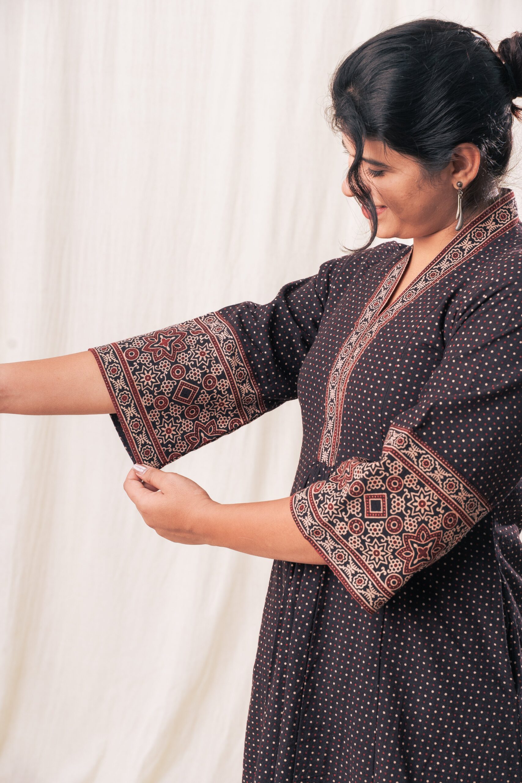 Crafted in soft, breathable fabric, this Ajrakh kurta set features a flattering V-neckline and a gently flared silhouette with roomy pockets for everyday ease. Paired with straight cream pants, it’s the perfect blend of comfort, artisanal charm, and effortless elegance.