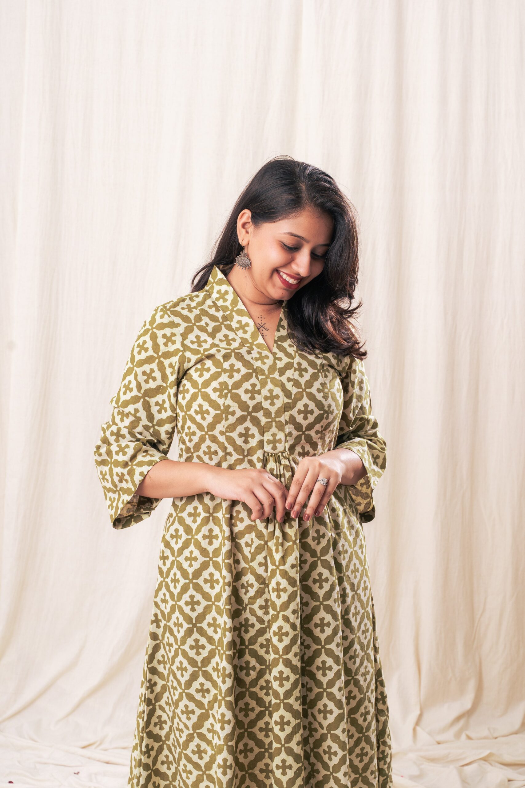 Crafted in soft, breathable fabric, this Dabu-printed kurta set features a flattering V-neckline and a gently flared silhouette with roomy pockets for everyday ease. Paired with straight cream pants, it’s the perfect blend of comfort, artisanal charm, and effortless elegance.