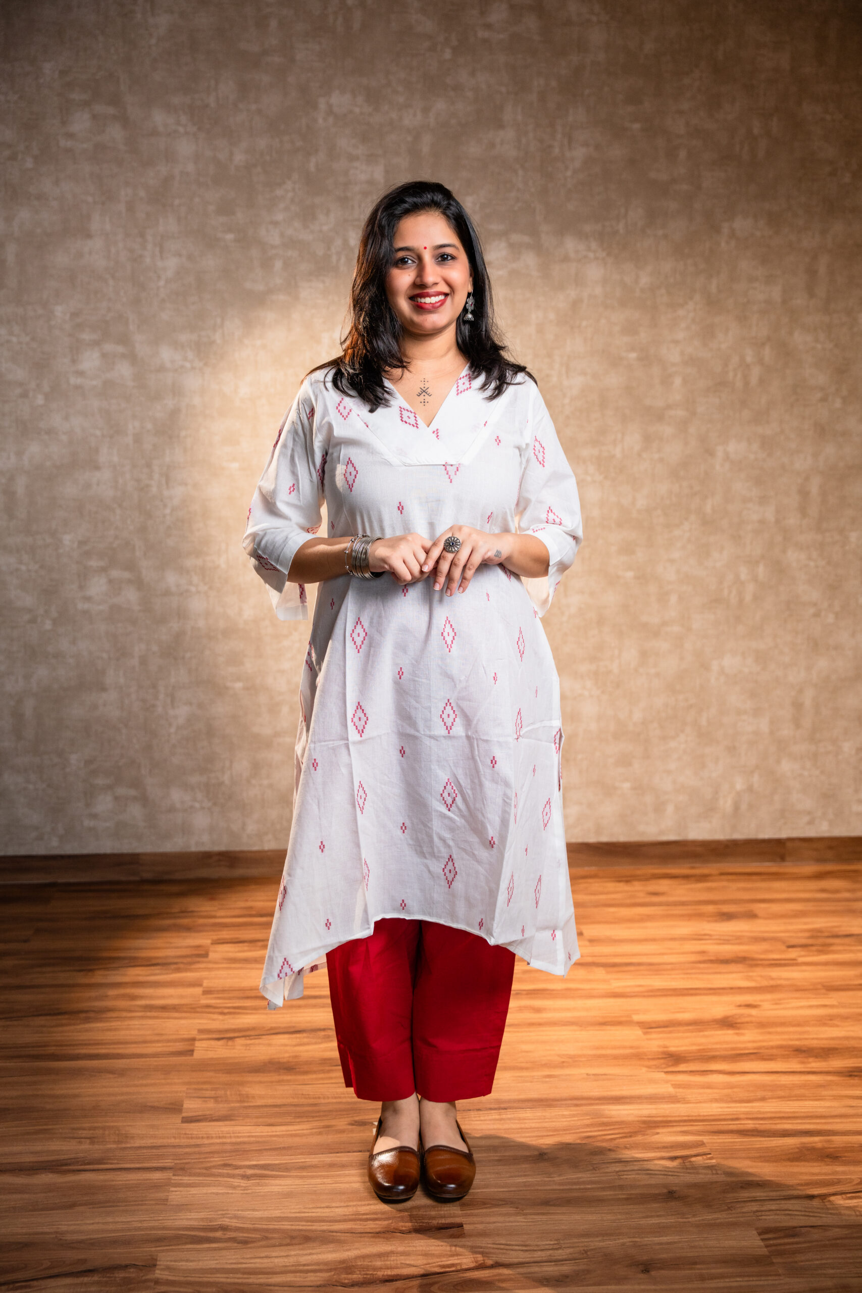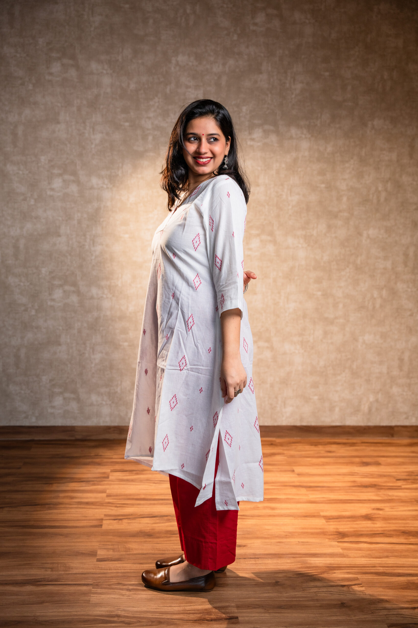 Timeless, fresh, and effortlessly graceful — this white handloom cotton kurta set redefines everyday elegance. The full-sleeves kurta features a V-neckline, side slit, and uneven hemline that adds flow and character to your look. Paired with soft cotton pants featuring pockets on both sides, it’s designed for women who love comfort without letting go of style.