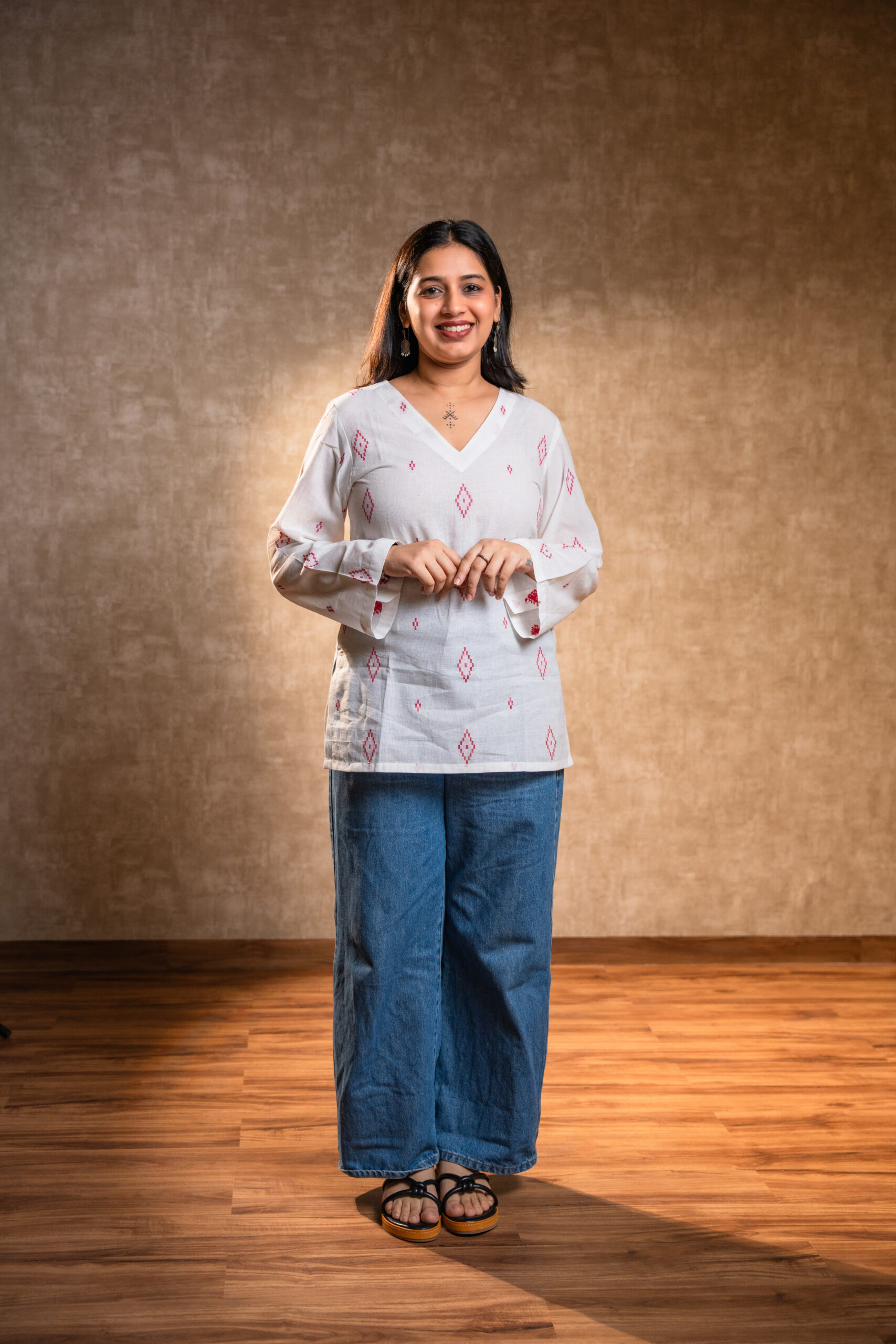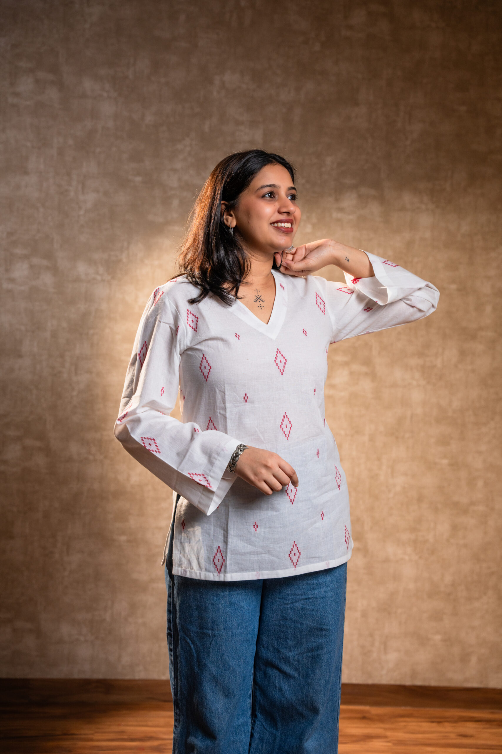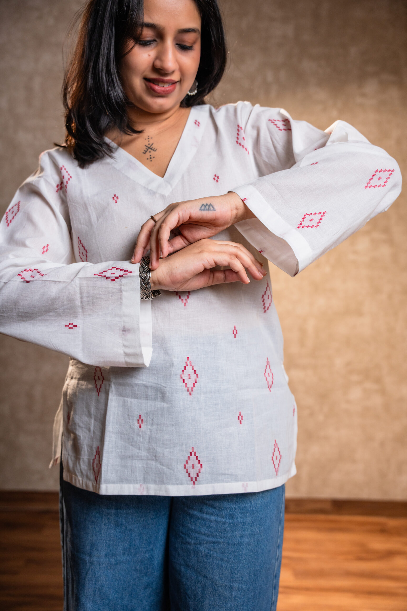 Crafted from pure handloom cotton, this kurta feels as soothing as a gentle breeze on your skin. Designed with a flattering V-neckline and elegant bell sleeves, it blends traditional craftsmanship with a modern silhouette. The breathable handwoven fabric keeps you comfortable all day long — whether you’re working, travelling, or just taking it slow.