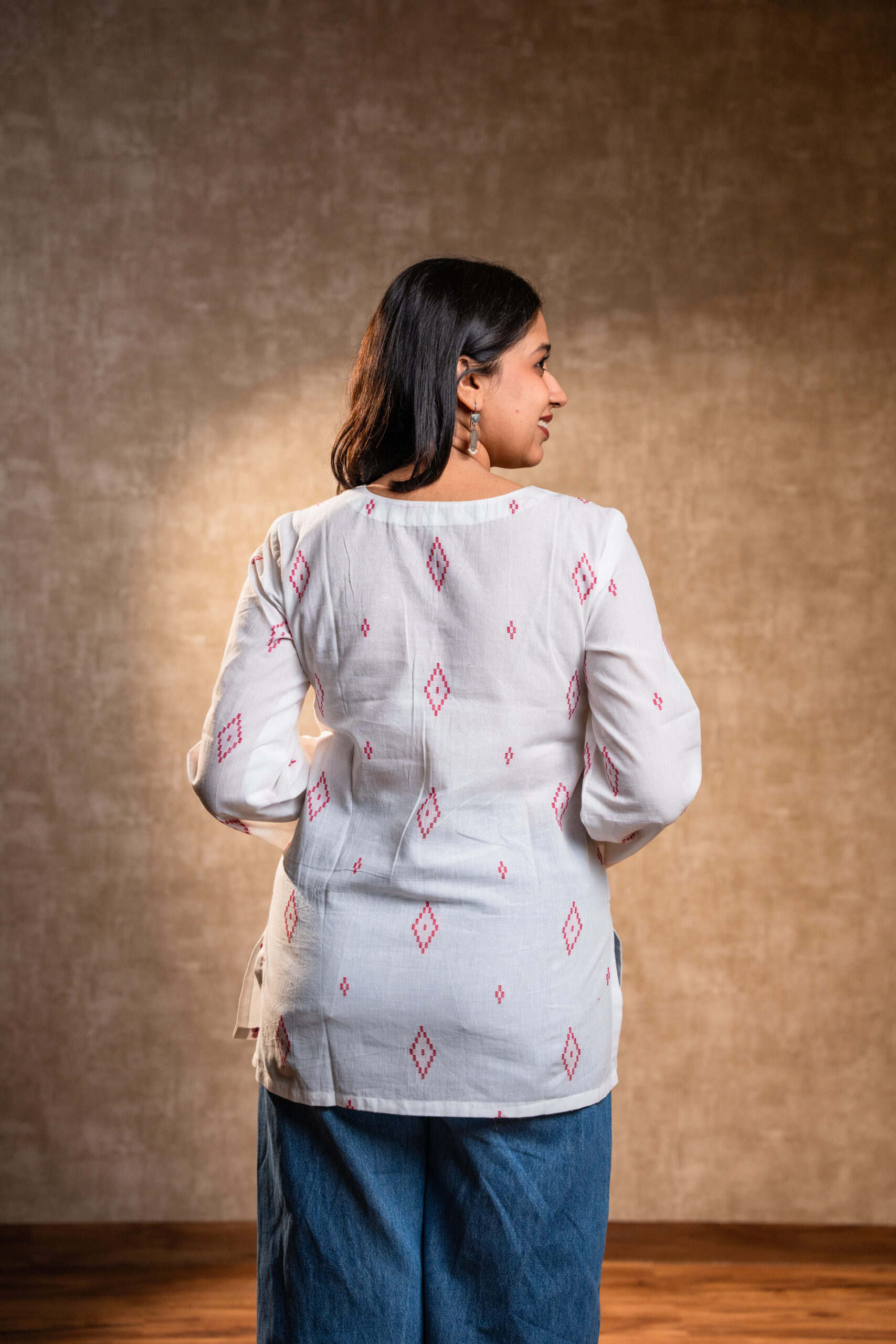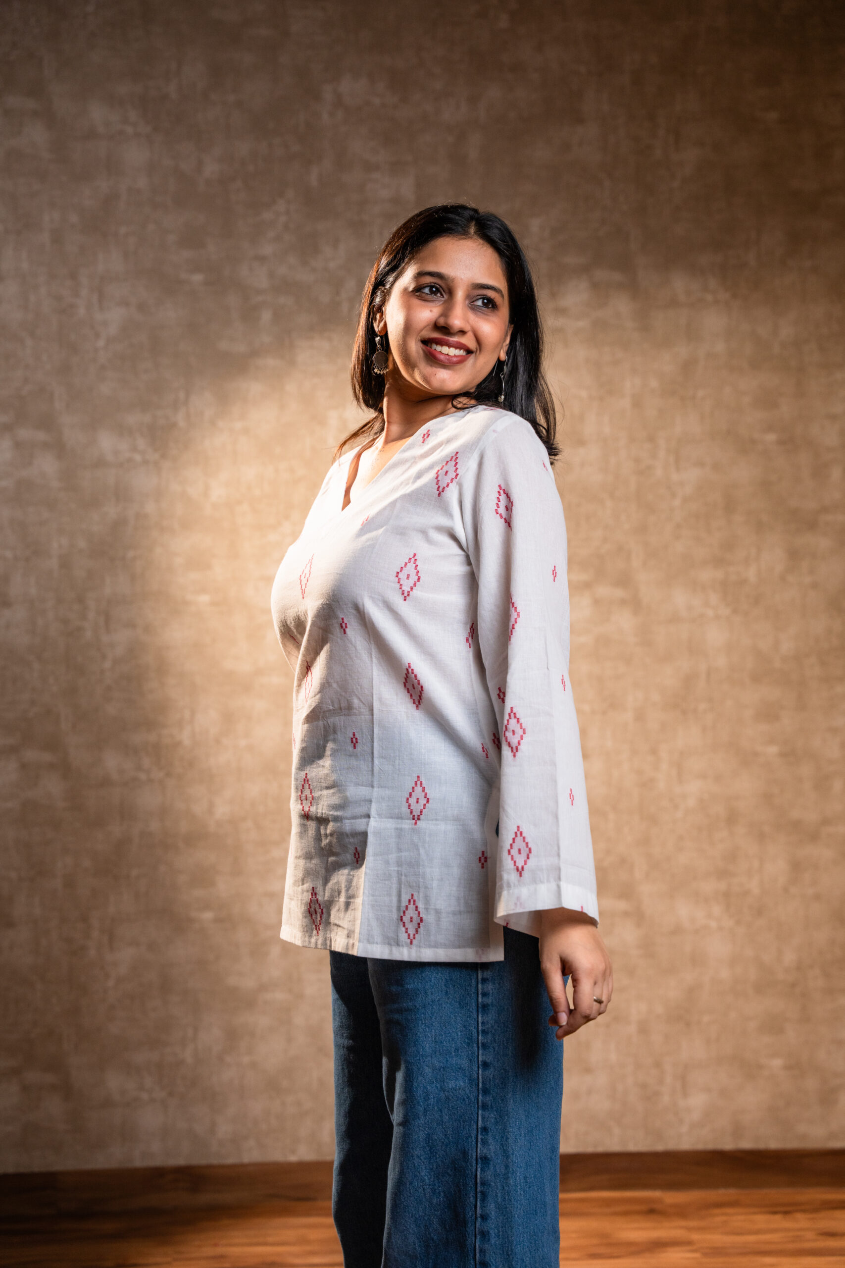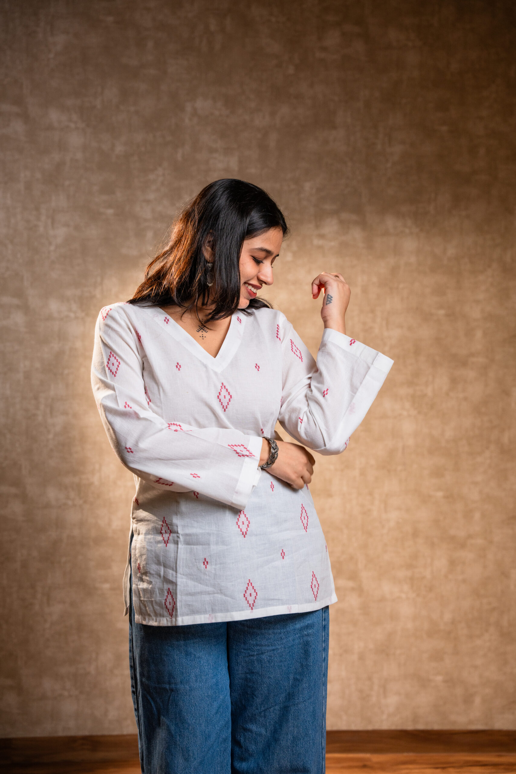 Crafted from pure handloom cotton, this kurta feels as soothing as a gentle breeze on your skin. Designed with a flattering V-neckline and elegant bell sleeves, it blends traditional craftsmanship with a modern silhouette. The breathable handwoven fabric keeps you comfortable all day long — whether you’re working, travelling, or just taking it slow.
