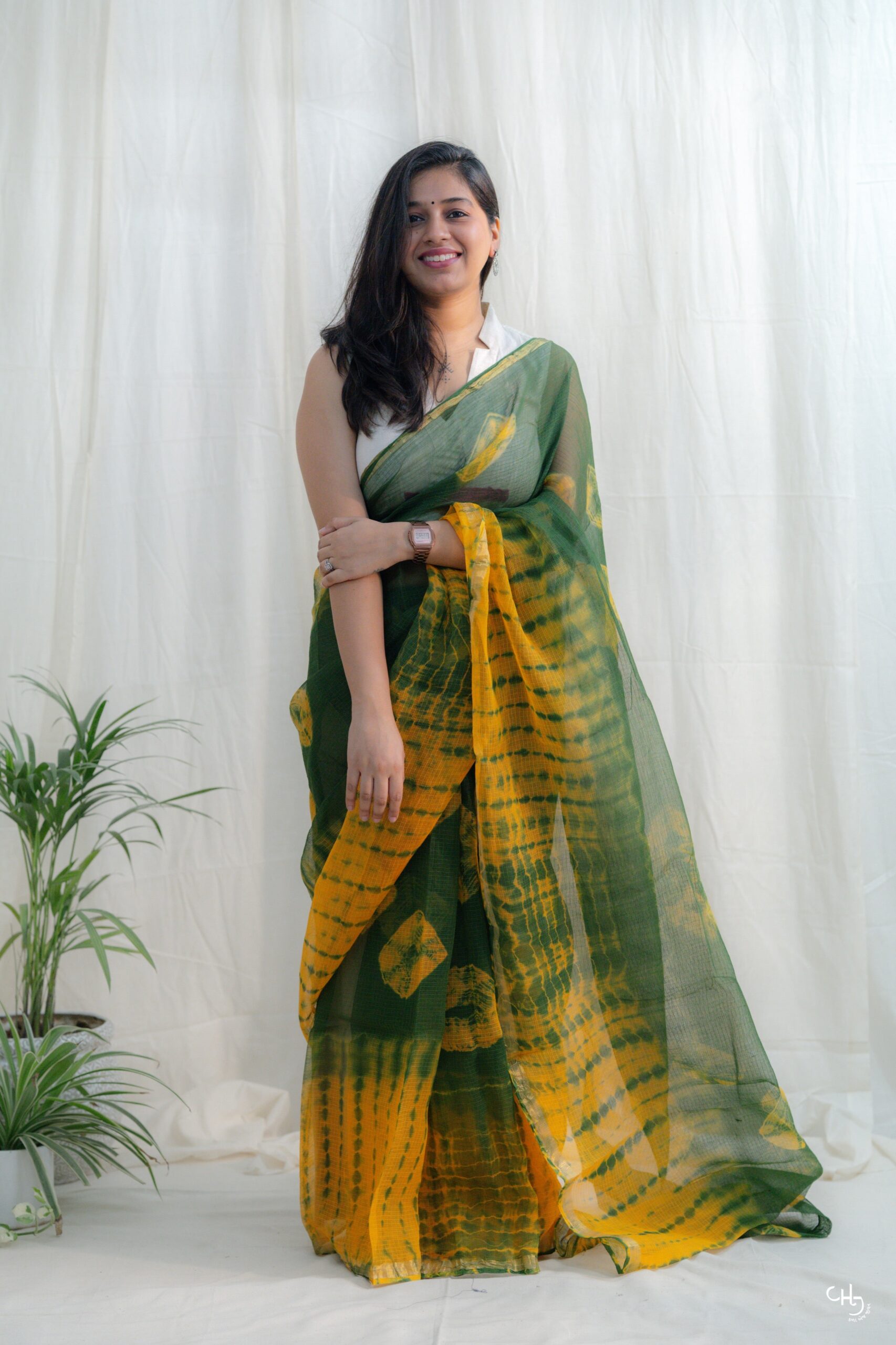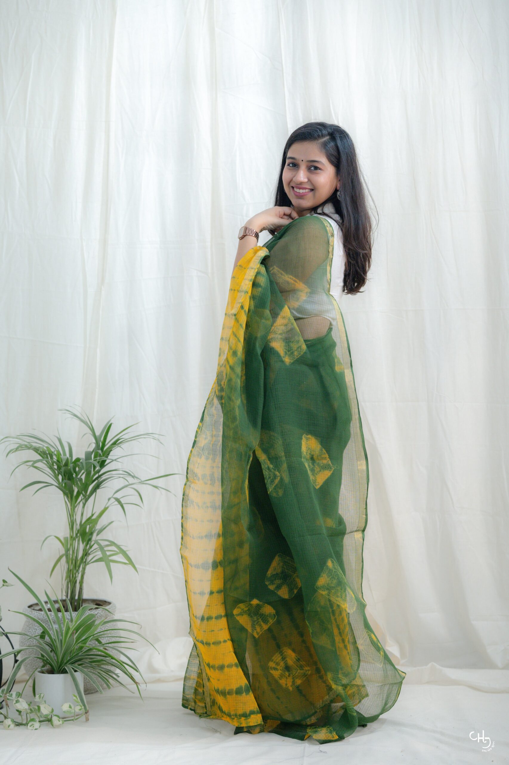 This hand-dyed Kota Doria Lugda saree brings together the lightness of cotton with the charm of traditional tie-dye. In cheerful hues of mustard yellow and leafy green, its soft texture and airy weave make it an effortless choice for both festive and casual wear.