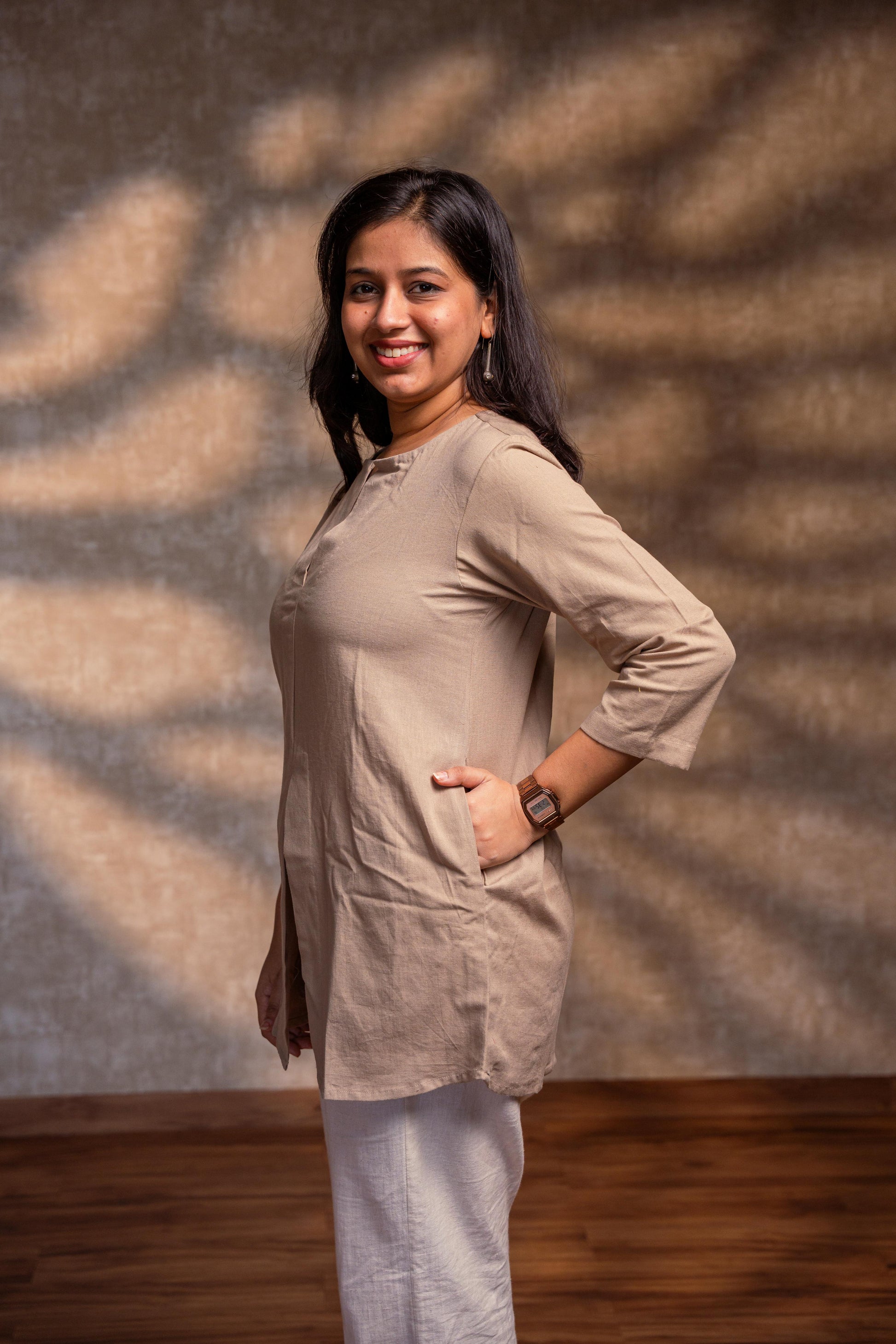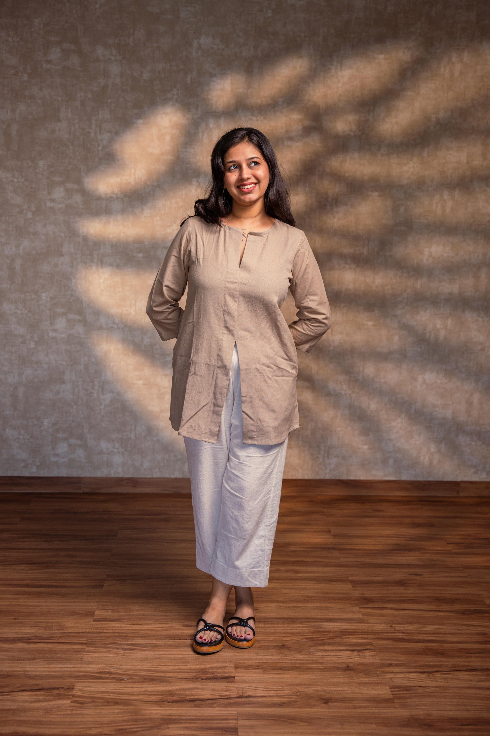 A relaxed beige cotton tunic designed for effortless everyday wear. Featuring a clean split neckline, three-quarter sleeves, functional pockets, and a subtle front slit, it offers breathable comfort with a minimal silhouette.