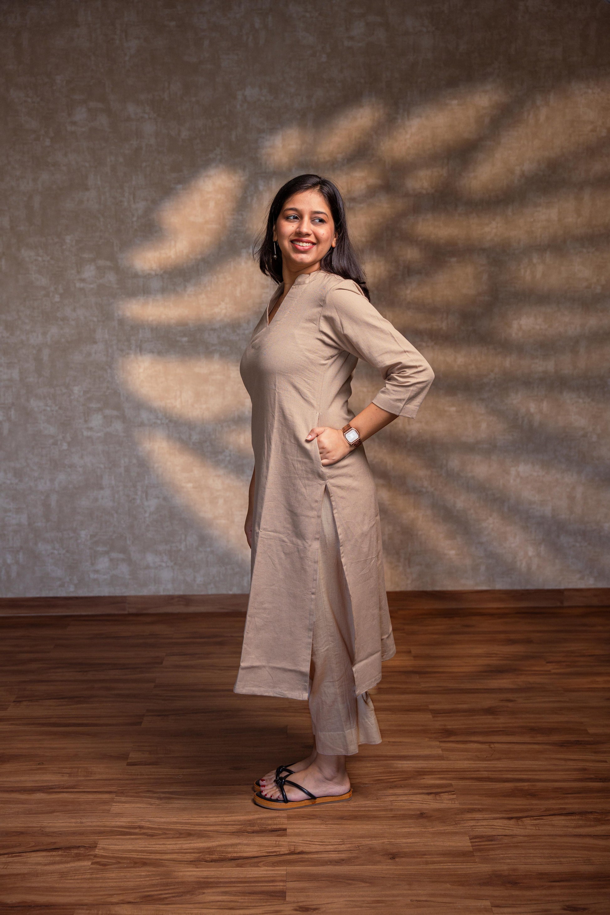 A classic straight-fit kurta crafted in soft, breathable cotton. Designed with a minimal stand collar, 3/4th sleeves, and side slit, functional pockets it’s an easy everyday essential.