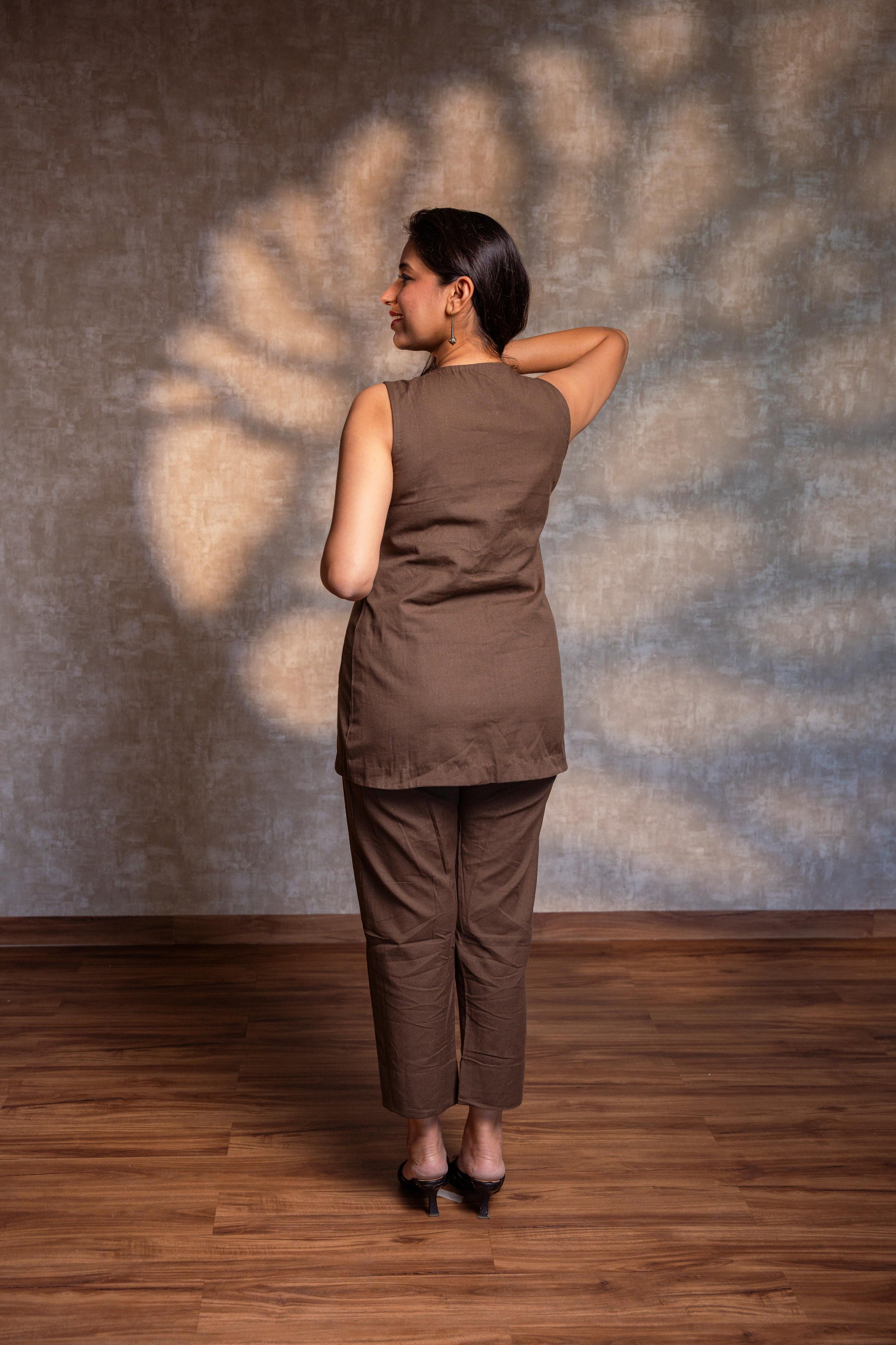 A classic brown cotton button-down top designed for ease and everyday comfort. Featuring a sleeveless silhouette, front wooden buttons, roomy patch pockets, and an apple-cut detail at the hem for a flattering finish.