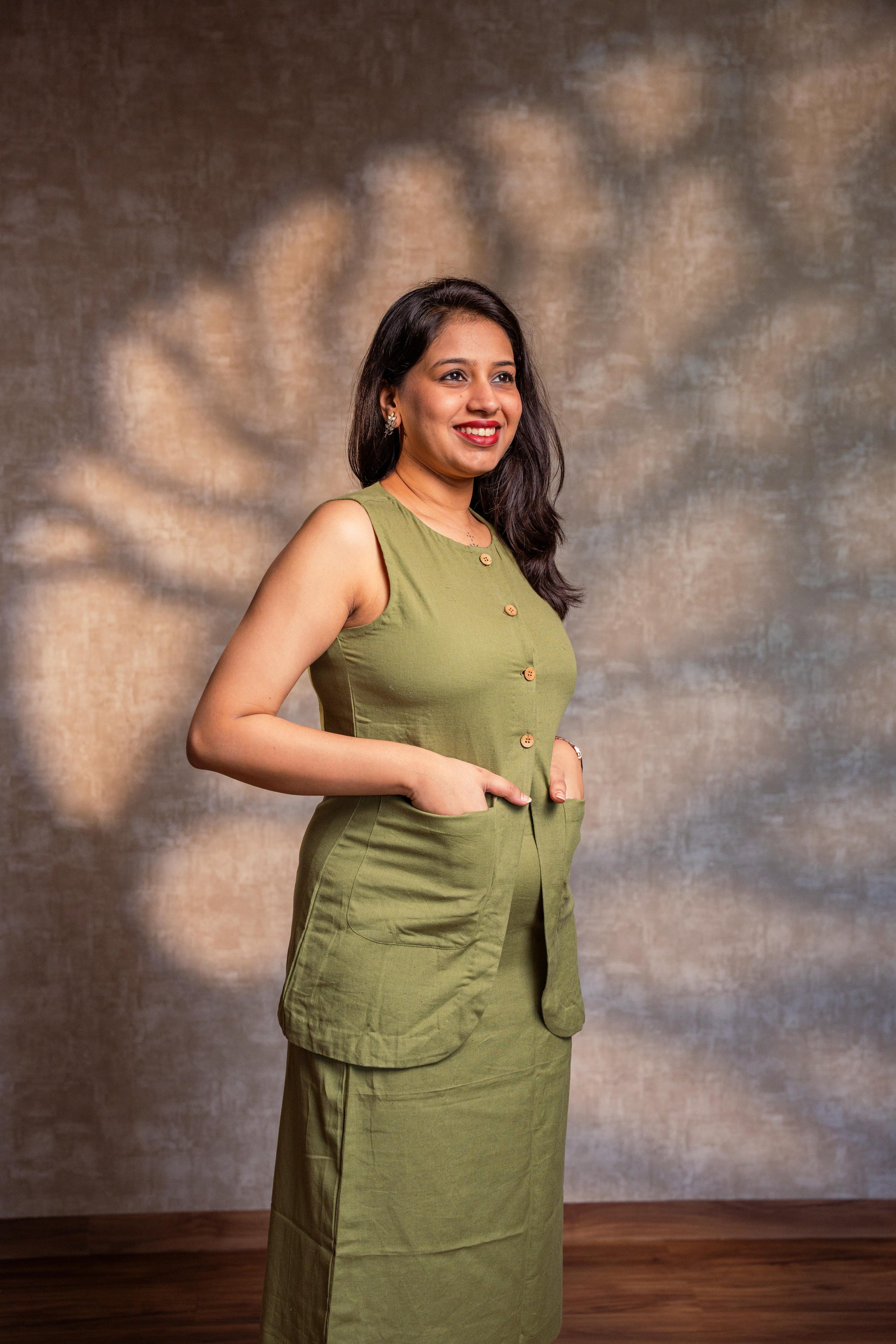 A classic light green cotton button-down top designed for ease and everyday comfort. Featuring a sleeveless silhouette, front wooden buttons, roomy patch pockets, and an apple-cut detail at the hem for a flattering finish.