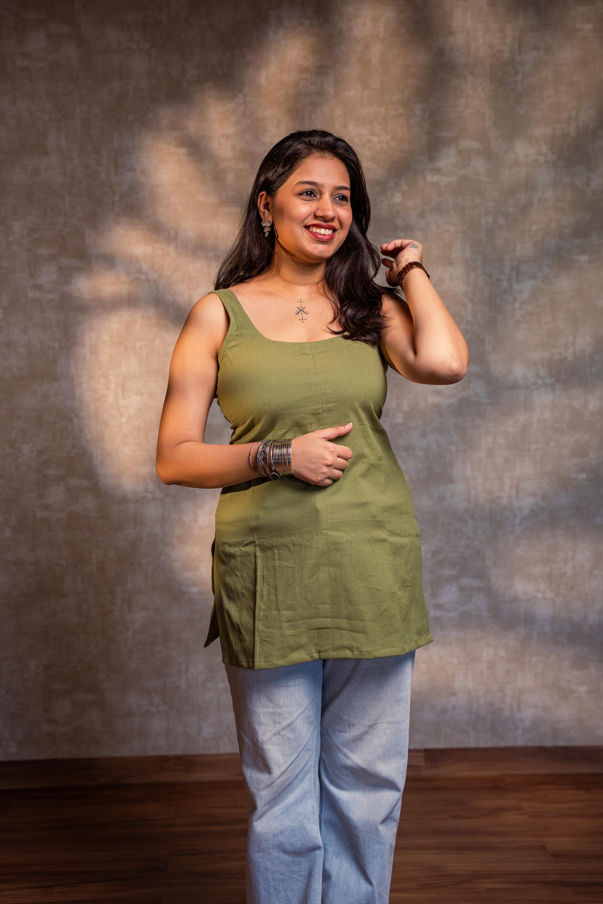 A relaxed light green cotton kurta crafted for effortless comfort. Designed with a straight fit, sleeveless silhouette, and side slits.